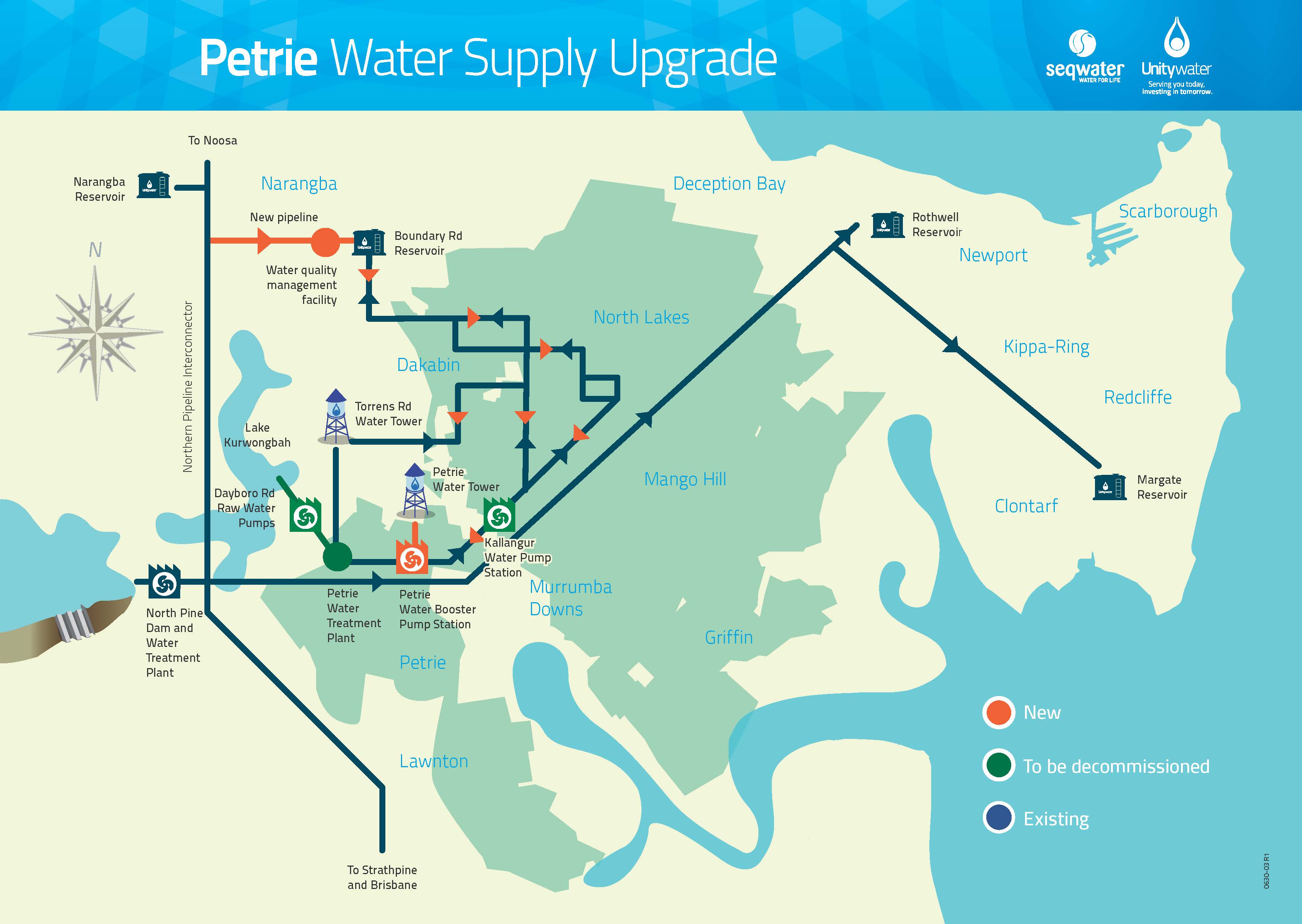 - A new pumping station and associated network configurations near the old Petrie Water Treatment Plant, as well as pipework reconfigurations and decommissioning of the Kallangur Pumping Station.