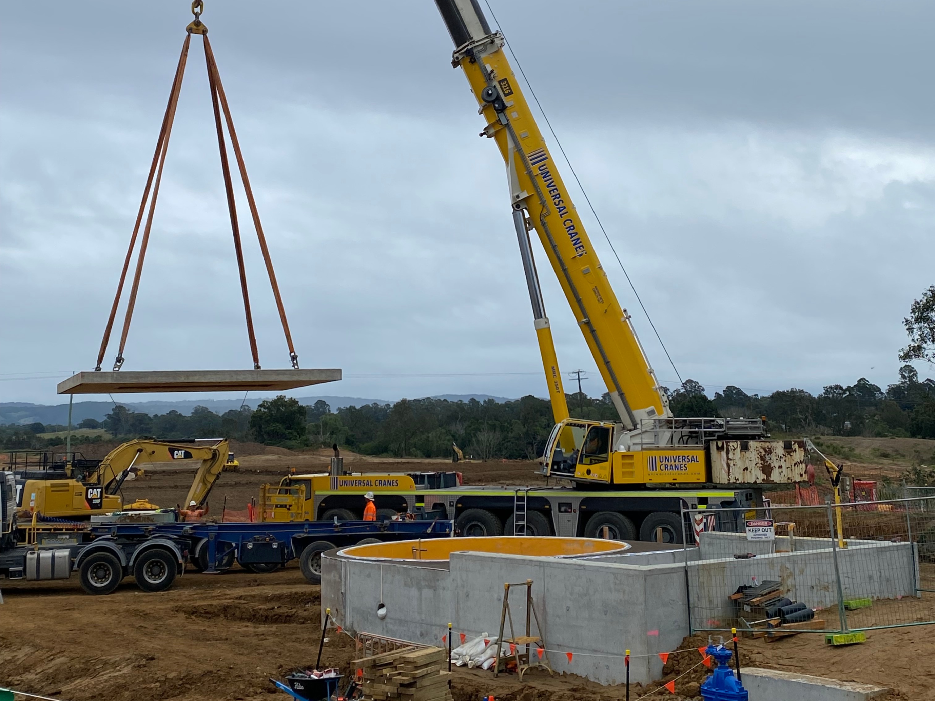 Media ReleaseA 350-tonne crane has lifted a 35-tonne slab into place to seal off a five-storey underground wet well marking an important milestone for Unitywater’s Waraba Wastewater Network Project during a period of unprecedented growth for the region.