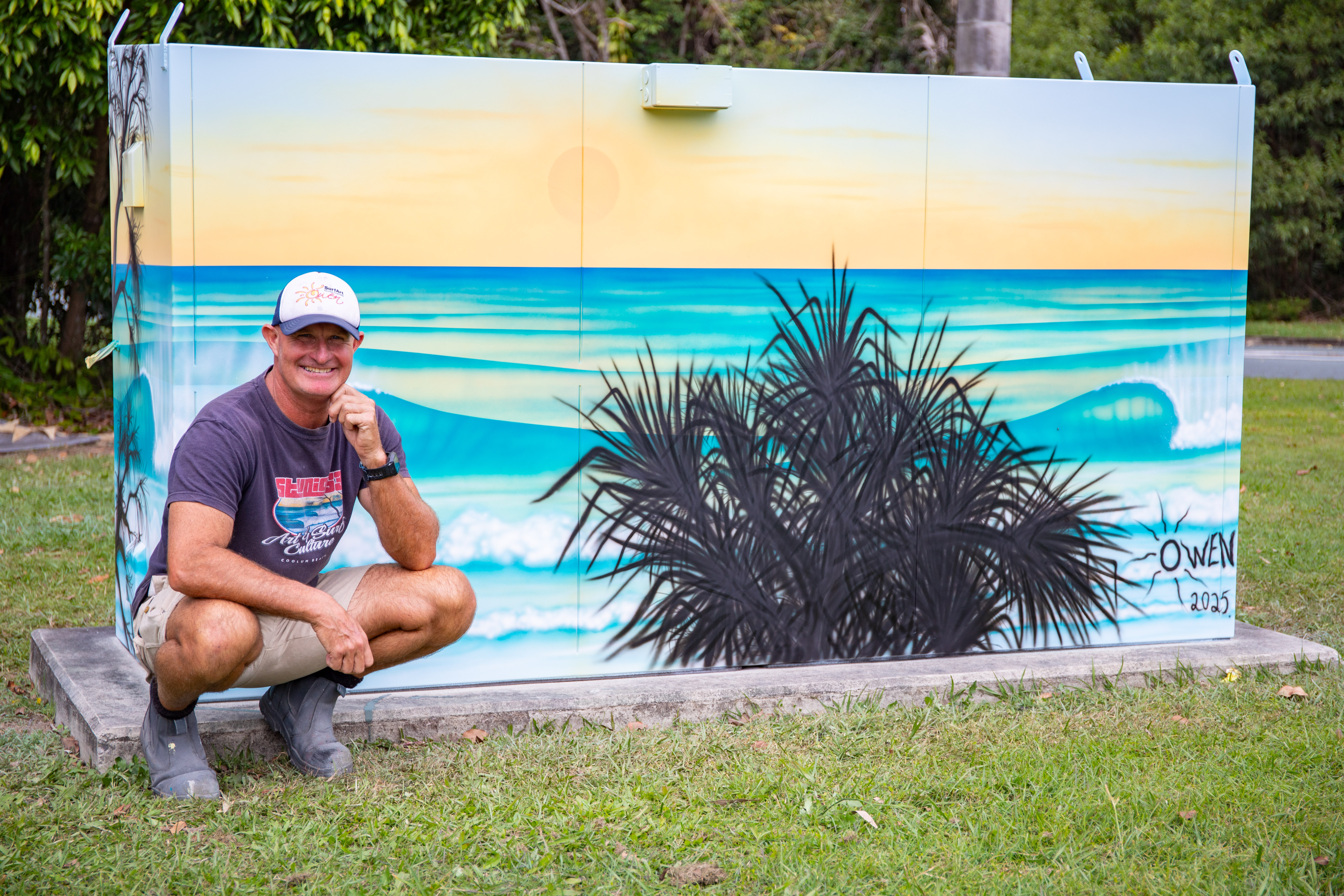 Media ReleaseA green roadside cabinet that powers essential wastewater services near Garth Prowd Bridge in Noosa Heads has had a facelift, with local artist Sammy Ray Jones transforming it with an eye-catching mural.